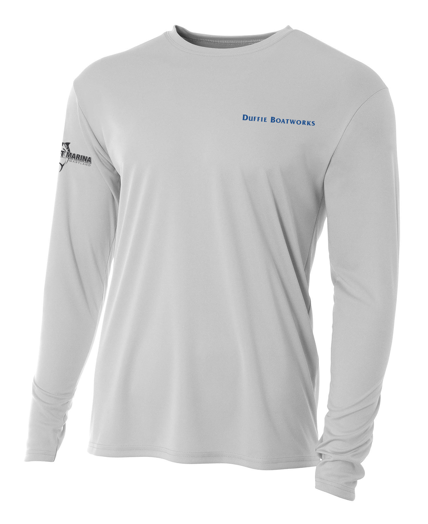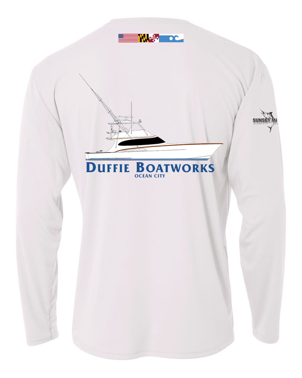 Duffie Boatworks x Sunset Marina collaboration. Featuring Duffie Boatworks logo on the chest, silhouette of the Billfisher on the back, flag detail at the top of the back and Sunset Marina’s logo on the sleeve. A4 moisture wicking material for optimal comfort year round.