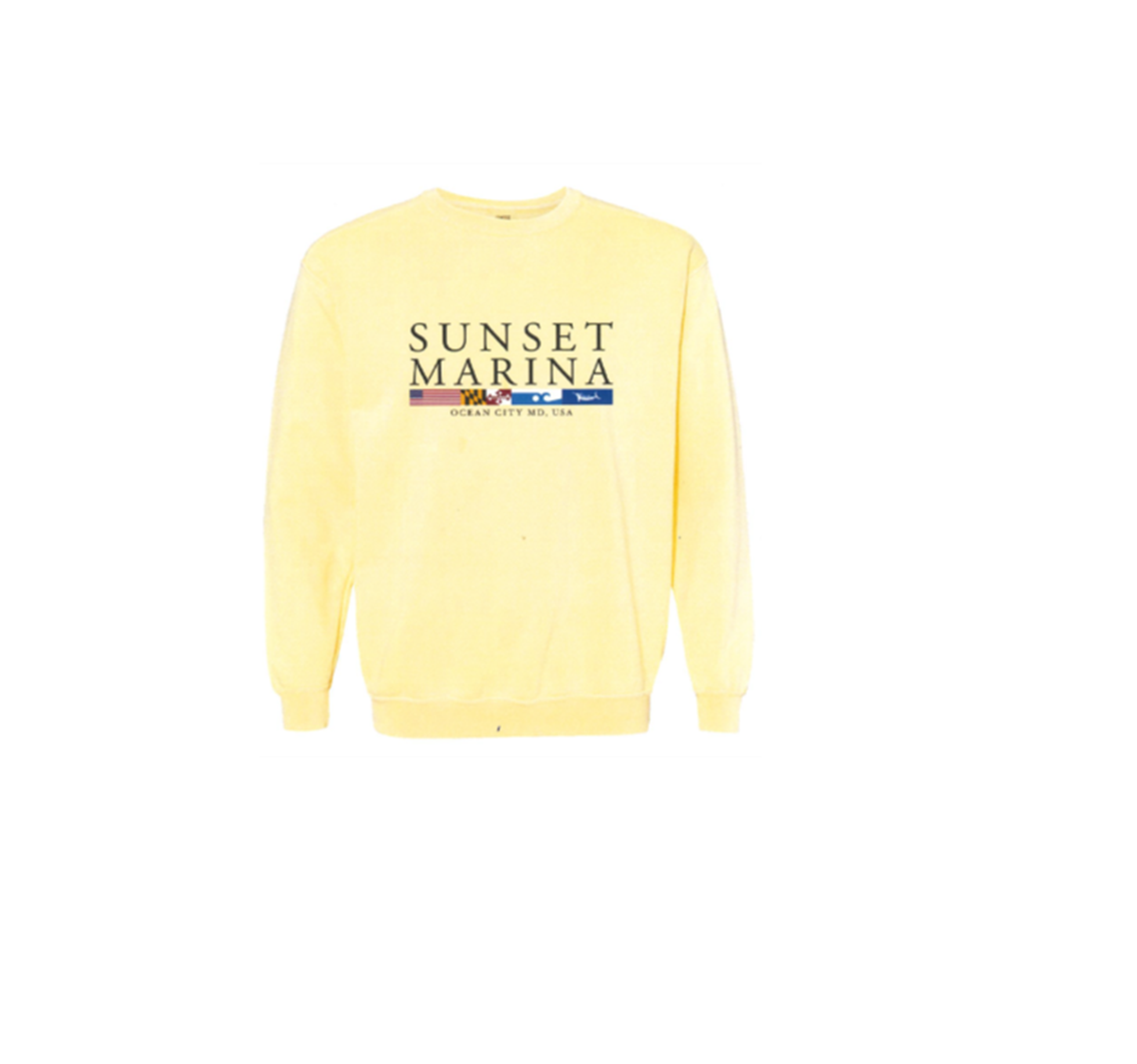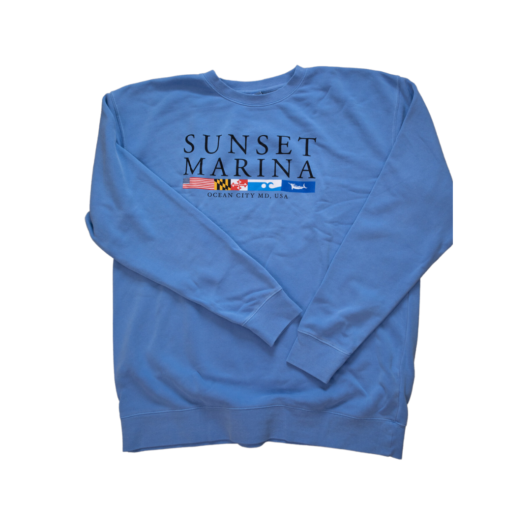 Classic crew-neck sweatshirt in three trendy and flattering color options. Featuring the Sunset Marina logo with various flags underneath. This Sweatshirt is trendy yet simple and tasteful highlighting USA,MD,OCMD,and White Marlin Nautical Flags.