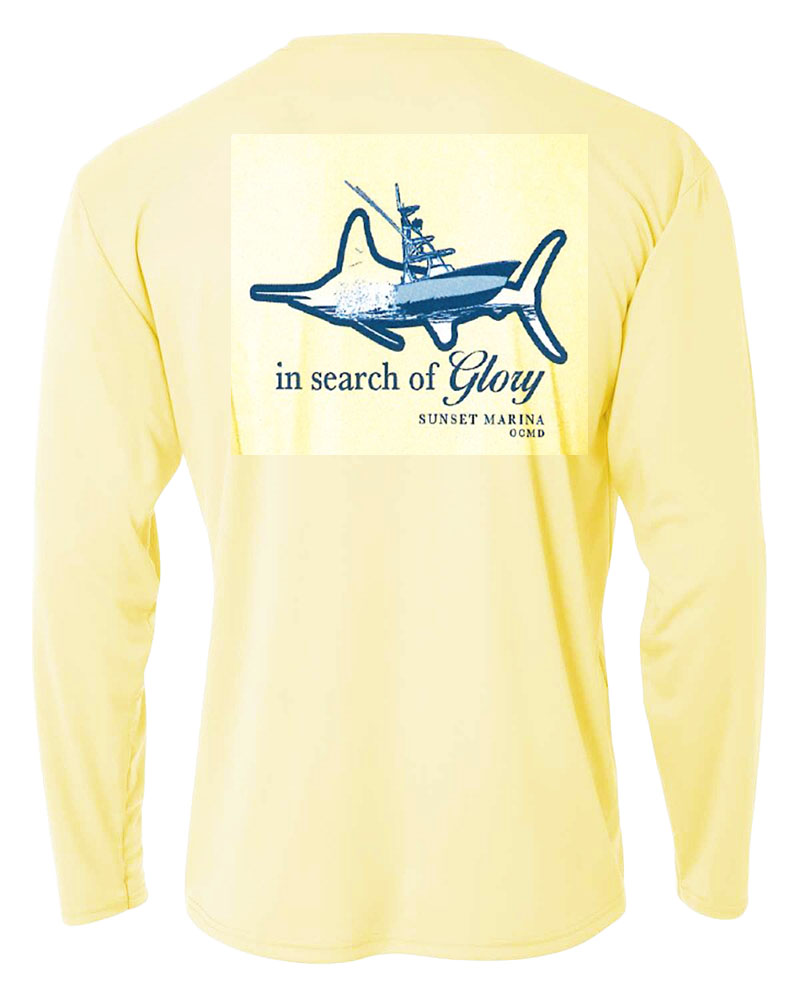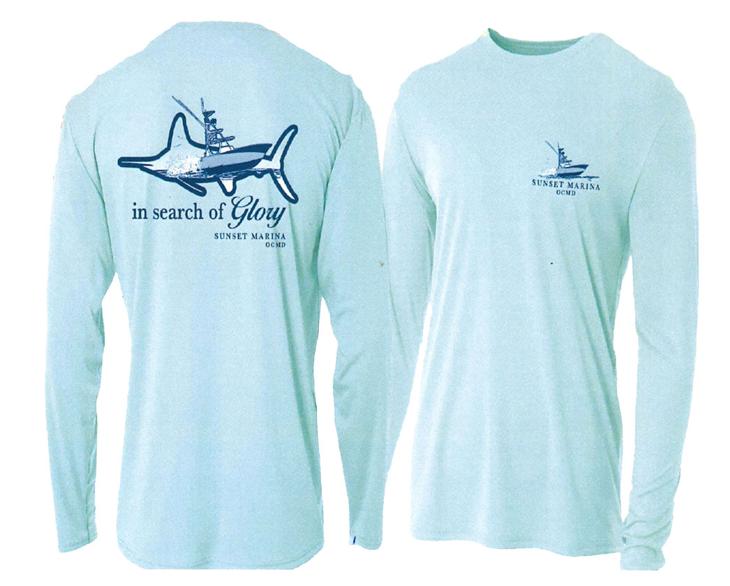 This Long Sleeve Performance Tee is made with the Popular “In Search of Glory/Sunset Marina Logo” that features the Marlin/Boat Design with the In Search Of Glory Logo on the back, and a Sunset Marina Boat Logo on the front Left. Choose from Two Flattering Color Options.