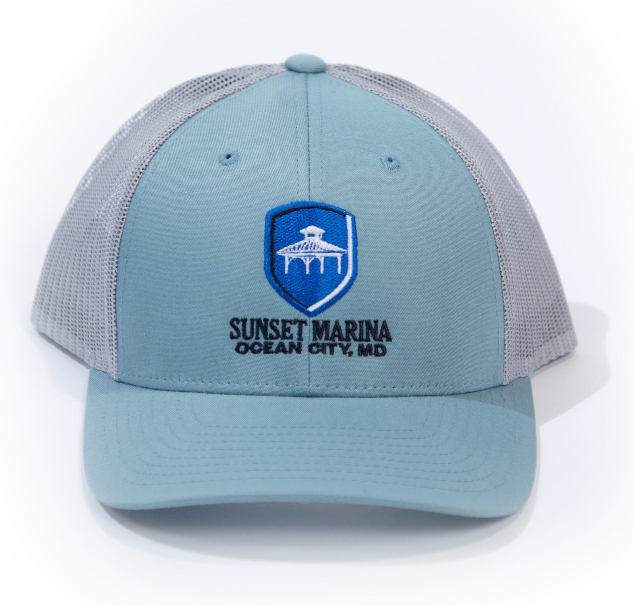 Sunset Marina Trucker with our pavilion design in direct embroidery. Classic trucker cap style with an adjustable snapback. One size fits most