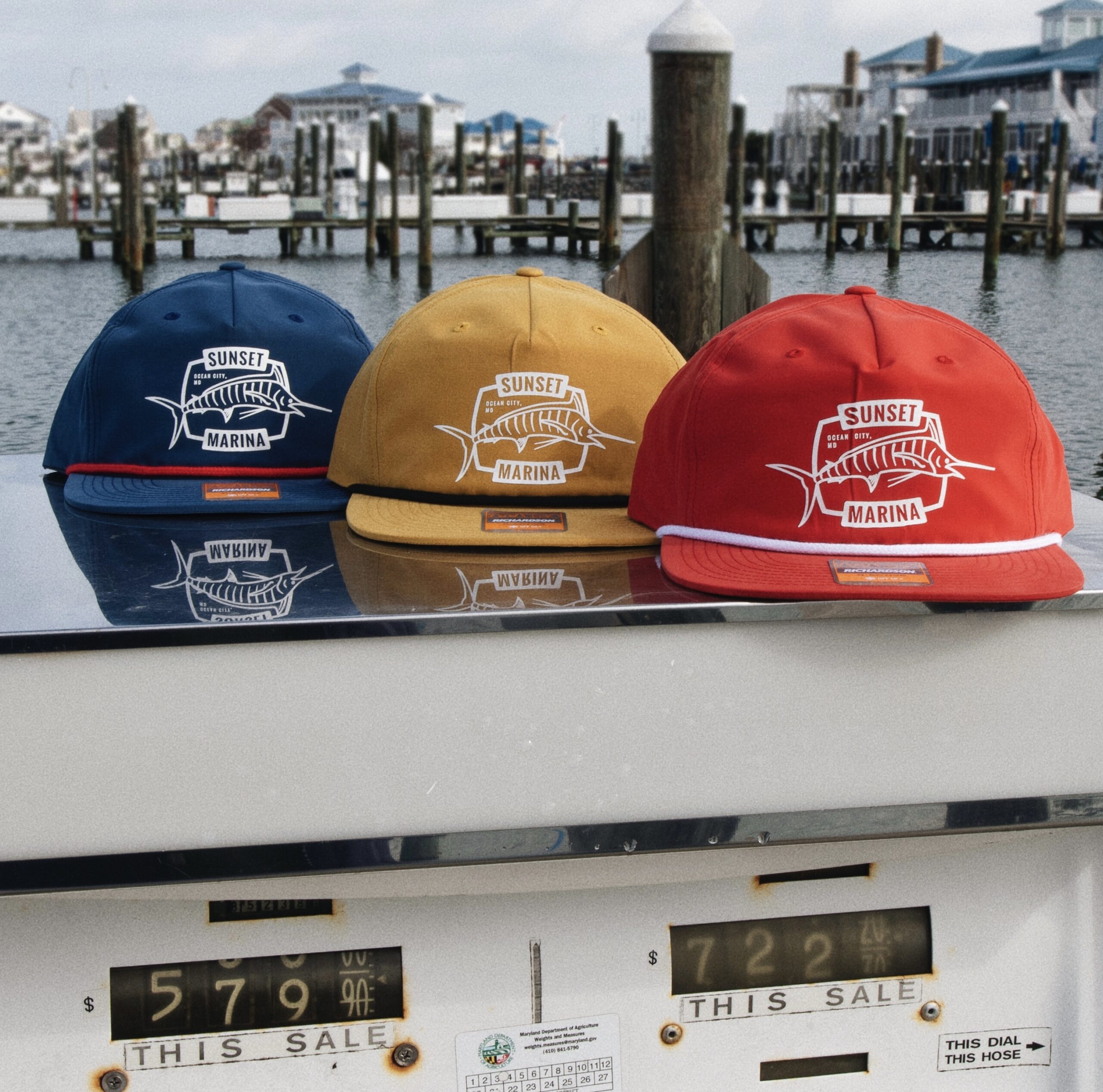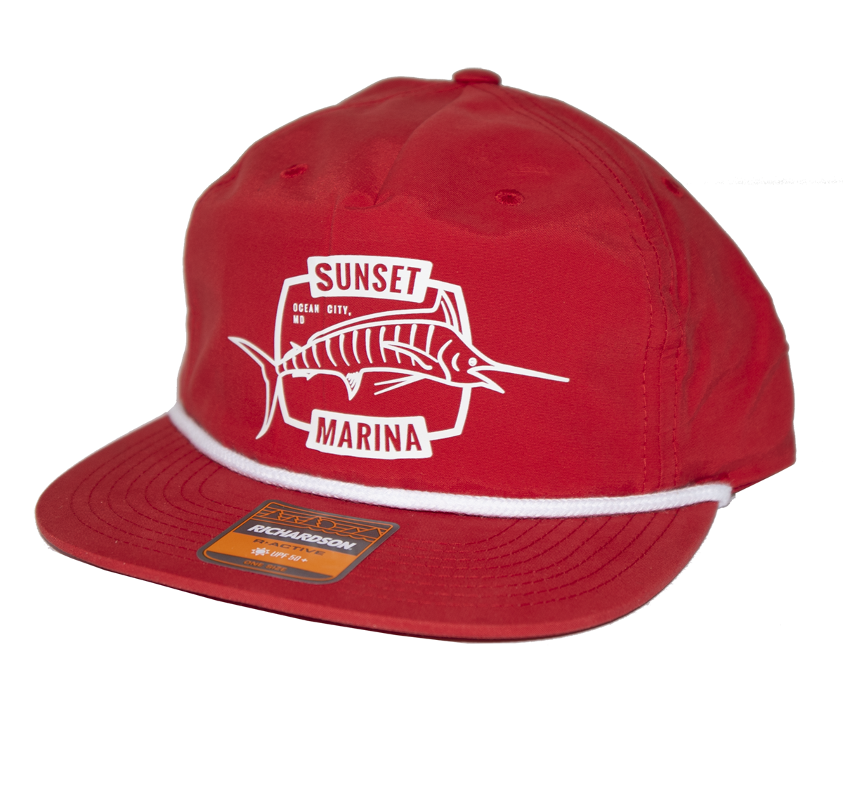 Features a silicone Sunset Marina marlin design. Flip-up buckram and a 5mm rope give this cap a unique look that’s sure to stand out in a crowd. Available in red,navy and biscuit. OSFM. Adjustable snap back closure.