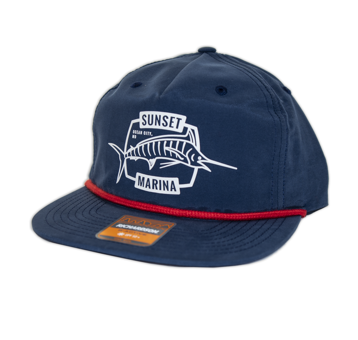 Features a silicone Sunset Marina marlin design. Flip-up buckram and a 5mm rope give this cap a unique look that’s sure to stand out in a crowd. Available in red,navy and biscuit. OSFM. Adjustable snap back closure.