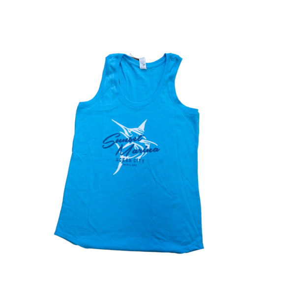 A perfect water lover blue color racerback tank with the 2023 Marlin Shadow Design. The Sunset Logo is printed large on the front with script font in a very nautical navy blue, over an outline shadow of a marlin in white on the front, while a small version sits on the top of the racerback on the back.