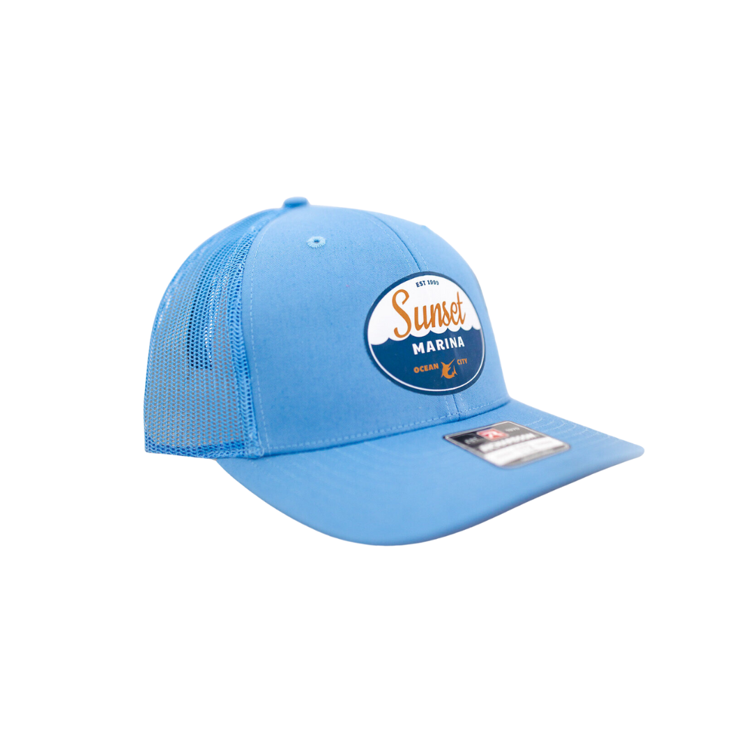 Oval Style Patch featuring an eye-catching orange script that reads “Sunset Marina EST 1999 Ocean City “. This design is an exclusive 2023 Sunset Logo showcasing a unique mini marlin on the ocean water/skyline.